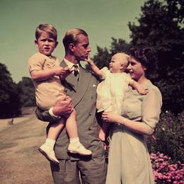Le prince Philip tient dans ses bras le petit prince Charles, tandis que la reine Elizabeth porte la princesse Anne bébé qui pose sa main sur la bouche de son père. (Clarence House, le 1er août 1951.)