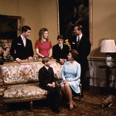 La reine Elizabeth et le prince Philip avec leurs quatre enfants, le prince Charles, la princesse Anne, le prince Andrew et le prince Edward, assis dans un salon du palais de Buckingham. (Buckingham, le 20 novembre 1970.)