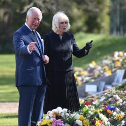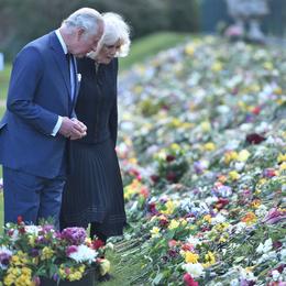Le prince Charles et son épouse devant les messages déposés par les Britanniques en hommage au prince Philip. (Londres, le 15 avril 2021.)