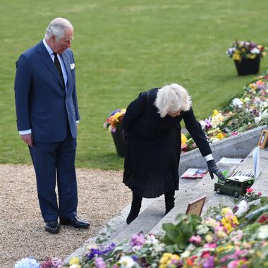 Dans les jardins de Marlborough House, le prince Charles et son épouse contemplent les messages en hommage au prince Philip, laissés par les Britanniques. (Londres, le 15 avril 2021.)