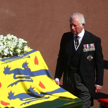 Le prince Charles lors de la procession accompagnant le cercueil de son père, le prince Philip, lors de ses funérailles. (Château de Windsor, le 17 avril 2021.)