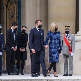 Brigitte Macron au bras de son mari sur le perron de la chapelle Saint-Jérôme, aux Invalides. (Paris, le 5 mai 2021.)