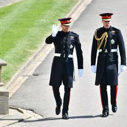 Le prince Harry arrive, lui, à pied au côté de son frère et témoin William, tous deux dans une version inattendue de l’uniforme militaire des «Blues and Royals», leur régiment de l’armée de l’air. (Windsor, le 19 mai 2018.)