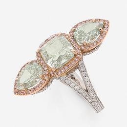 Bague en or gris et rose, diamant coussin de 2.06 carats fancy light green, deux diamants poires fancy green, diamants blancs et roses. Estimation : 100.000 – 120.000 €.