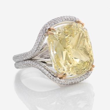 Bague en or gris, diamants et un diamant jaune taille coussin de 29.02 carats fancy yellow. Estimation : 380.000 – 420.000 €.