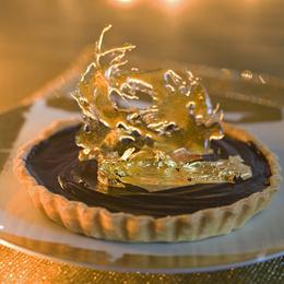 La classique et somptueuse tarte au chocolat est présentée avec quelques feuilles d’or pour une gourmandise ultra élégante.