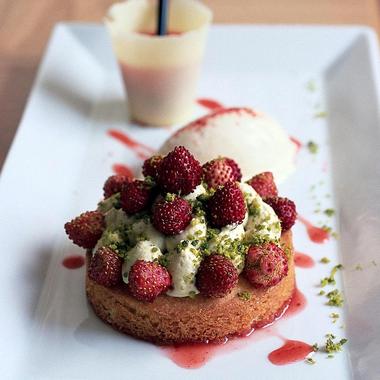 Le chef Cyril Lignac allie le croquant des sablés bretons, l’onctuosité de la crème de pistache et la fraîcheur des fraises des bois.