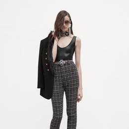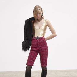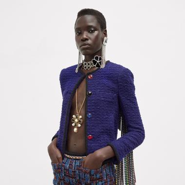 On retrouve ainsi les silhouettes éminemment féminines du créateur belge en charge des collections depuis 2016. Tout comme sa meilleure partition : une mode vertigineuse tout en jambes et en coupes impeccables teintée d’un twist provoc’ et clinquant, inspiré de la garde-robe de la chanteuse canadienne Peaches. Vaccarello veut mettre un peu de folie dans le vestiaire de la bourgeoise. Il s’y prend en entrechoquant les couleurs, en misant sur le body métallisé au décolleté vertigineux, des cascades de bijoux de fantaisie ou encore des ourlets en fausse fourrure qui côtoient avec caractère le tweed sage des vestes courtes. Pas de doute, cette fille Saint Laurent est prête à en découdre avec la nuit.