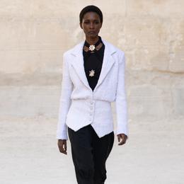 Cet endroit monumental et magique a aussi été choisi pour souligner les liens d’amitié qui unissait Jean Cocteau et Coco Chanel. Au début des années 1920, le poète avait fait appel à celle qu’il considérait comme « la plus grande couturière de son époque » pour réaliser les costumes de trois de ses tragédies – Antigone, Orphée et Œdipe roi– puis ceux du Train Bleu. Ils étaient devenus très proche. Cocteau et Coco donc, en toile de fond et Virginie Viard aux manettes de cette collection qui lui ressemble aussi beaucoup. « J’avais envie de quelque chose d’assez rock, explique la directrice artistique. Beaucoup de franges, en cuir, en perles ou paillettes, des tee-shirts à l’effigie de Lola Nicon -le nouveau mannequin fétiche de la maison qui avait joué la mariée sur un cheval blanc lors du dernier défilé haute couture, NDLR- telle une rockstar, portés avec des tailleurs en tweed gansés de larges galons, des babies argentées pointues ». Virginie Viard donne aussi à ces mannequins une allure à la fois punk et sixties. Ces princesses Chanel portent des mini jupes très couture sur des bas résilles et aiment autant les pièces brodées d’étoiles et de soleil et les cascades de sautoirs que les colliers de chien ou les bijoux de piercing sur les lèvres. En noir et blanc, très chic, elles jouent aussi parfois les filles décontractées en pantalon fluides et débardeurs.