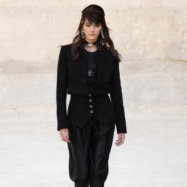 Tout a commencé avec Le Testament d’Orphée tourné par Jean Cocteau en 1959 dans les Carrières de Lumières aux Baux-de-Provence. Ce film, Virginie Viard l’a découvert récemment et il a été le point de départ de sa collection Croisière 2021-2022 pour Chanel. « C’est poétique, fort, simple, d’une telle justesse. Cela m’a donné envie d’une collection très nette, noire et blanche, tout en contraste, avec des touches un peu punk », raconte t-elle. Mais le lieu du tournage l’a aussi ébloui. « Les Carrières de Lumière sont uniques, impressionnantes. Dès l’entrée, avec cette grande porte qui ouvre sur la nuit, puis les carrières, en pleine lumière du jour. C’est le plus bel endroit qui existe pour faire un défilé », poursuit-elle. Ces pièces excavées et crayeuses bercées par le ciel et les rayons du soleil sont en effet cinématographiques à souhait .