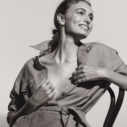 Bague Horizon, pavée en or blanc et diamants, et bagues Horizon, en or blanc, rose, jaune et diamants, De Beers, Bague Coco Crush Toi et Moi, en or beige, or blanc et diamants, et bagues Coco Crush, en or jaune, or beige et or blanc, Chanel Joaillerie. Chemise Burberry.