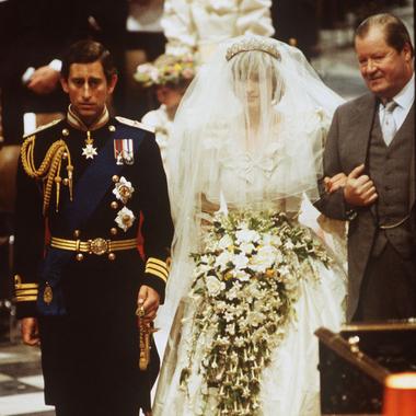 Edward Spencer au bras de sa fille, la princesse Diana lors de son mariage avec le prince Charles. (Londres, le 29 juillet 1981.)
