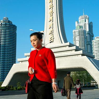 Veste pimpante, sac à main, bijoux et téléphone portable : une Coréenne typique de la jeunesse favorisée, sur l’avenue Ryomyong.