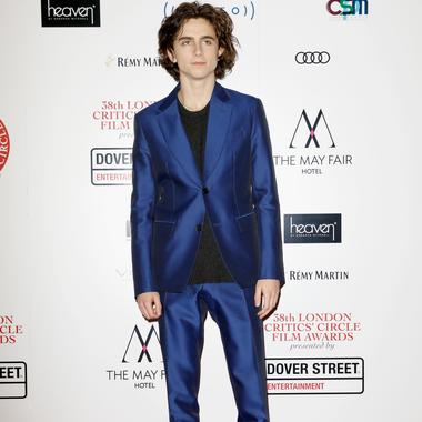 Timothée Chalamet en costume bleu nuit satiné Berluti aux London Film Critics Circle Awards. (Londres, le 28 janvier 2018.)